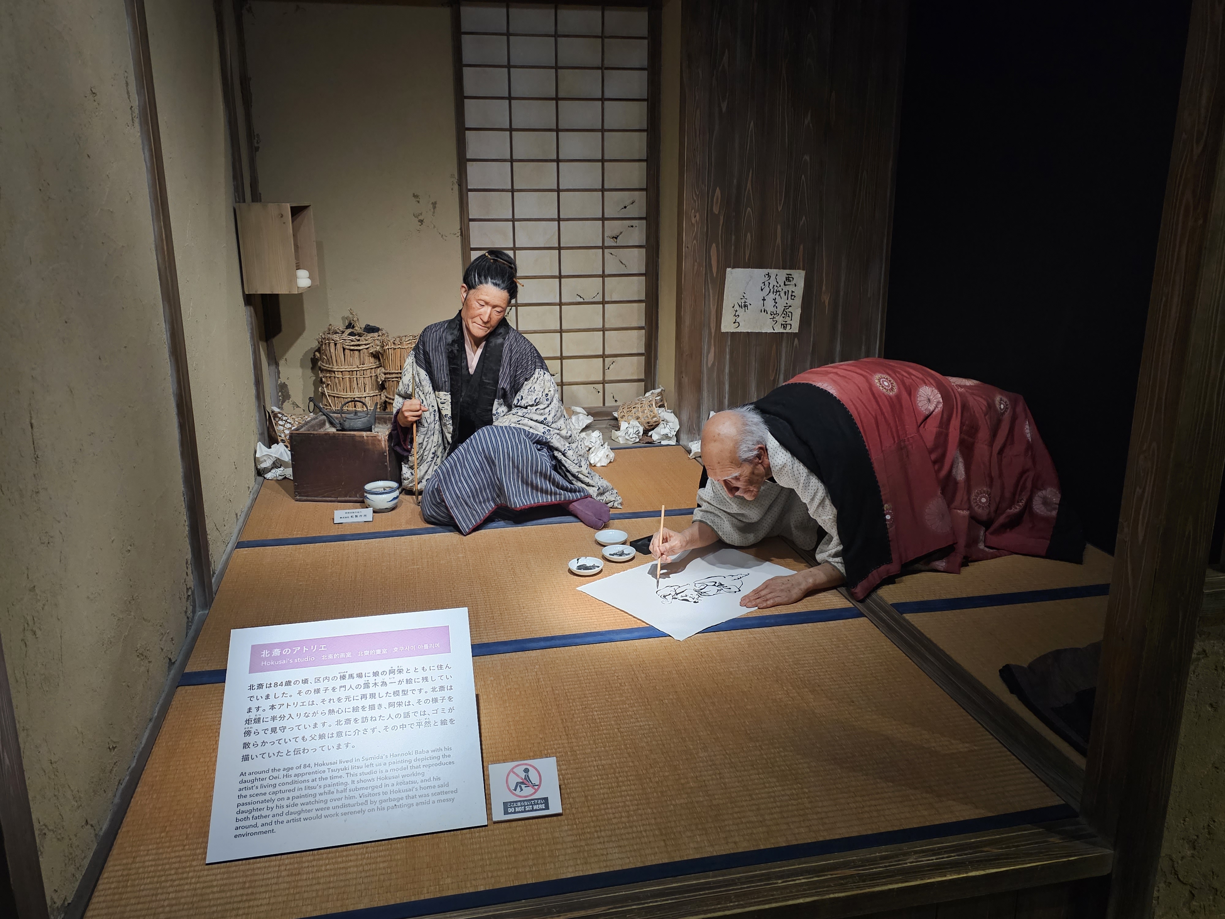 호쿠사이의 생전 모습을 밀랍 인형으로 표현한 전시이다.
