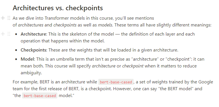 Architecture과 checkpoint에 대한 HuggingFace의 설명이다.