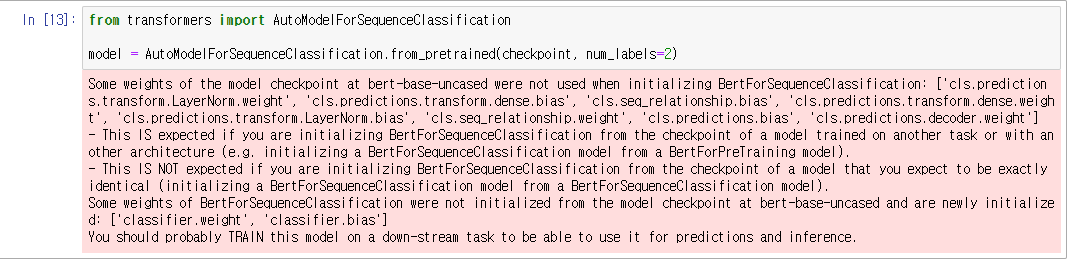 pretrained model의 헤드가 버려지고 새로운 헤드가 추가되기 때문에 출력되는 것이다.