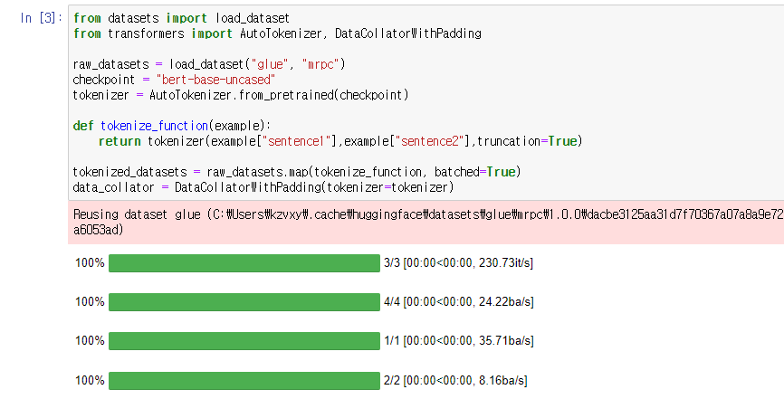 마지막으로 DataCollatorWithPadding은 Dynamic Padding(batch (전?) 단계에서 padding)을 하게 해주는 패키지이다.
