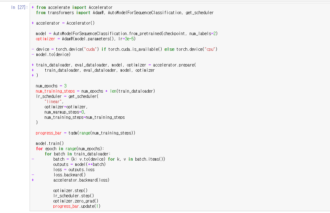 추가로 분산 학습을 도와주는 Accelerator 패키지를 적용한 코드이다.