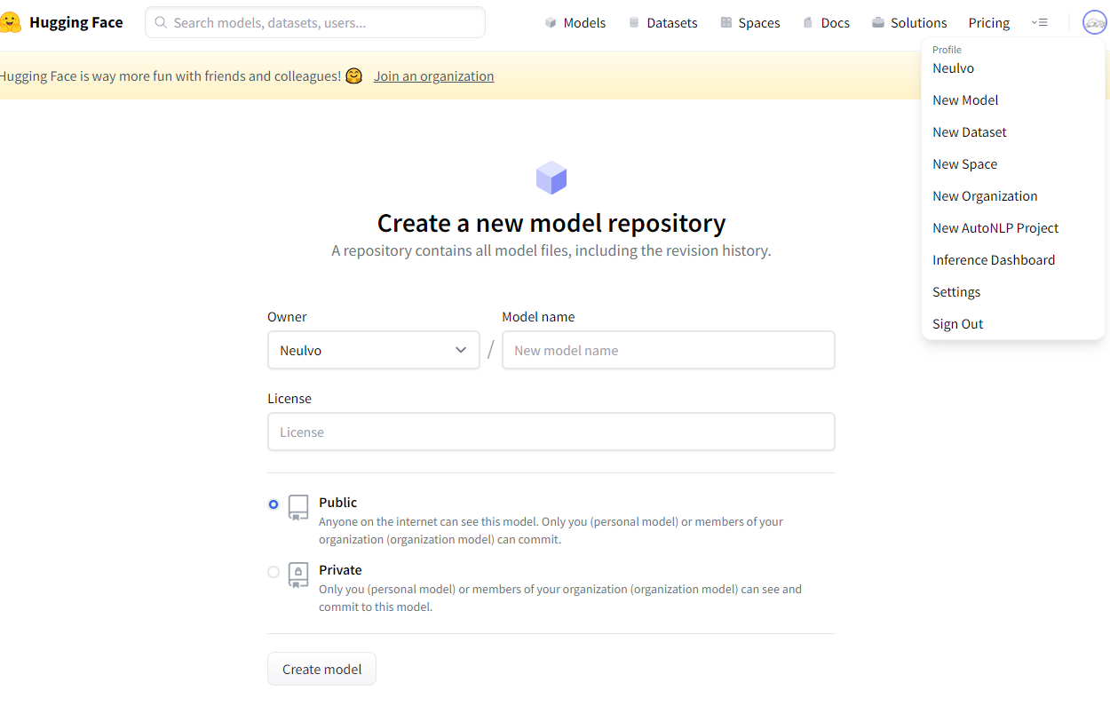 오른쪽 Account 버튼의 New Model 탭을 사용해 웹에서 레포지토리를 만들 수도 있다.