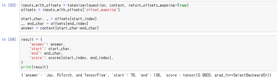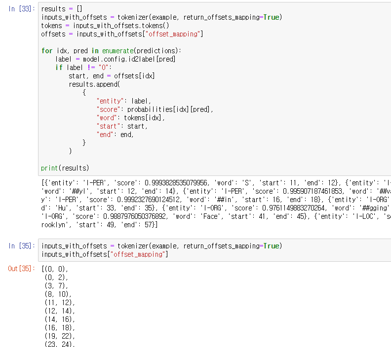 tokenizer에 return_offsets_mapping 옵션을 줘서 idx를 함께 출력한 것.