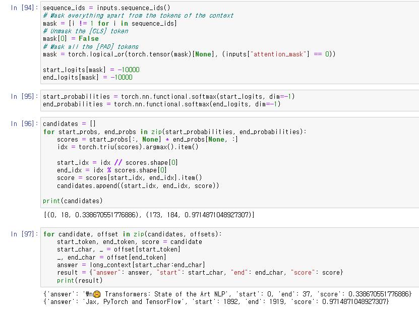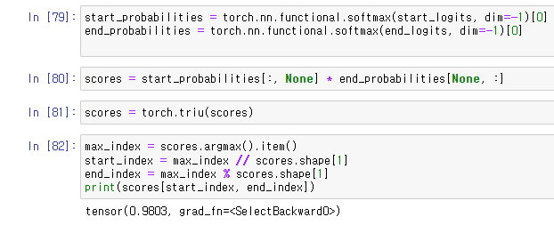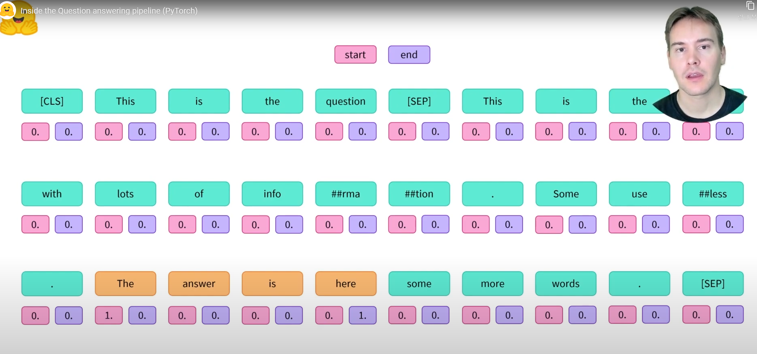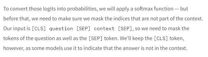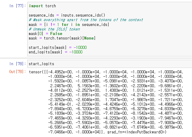 이 모델은 answer의 첫 토큰과 마지막 토큰을 계산하는, 총 두 개의 tensor of logits를 리턴해준다.