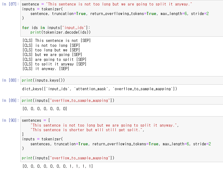 overflow_to_sample_mapping은 각 결과값이 어떤 문장과 대응하는지 보여준다.