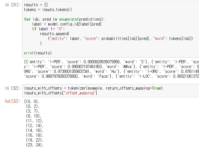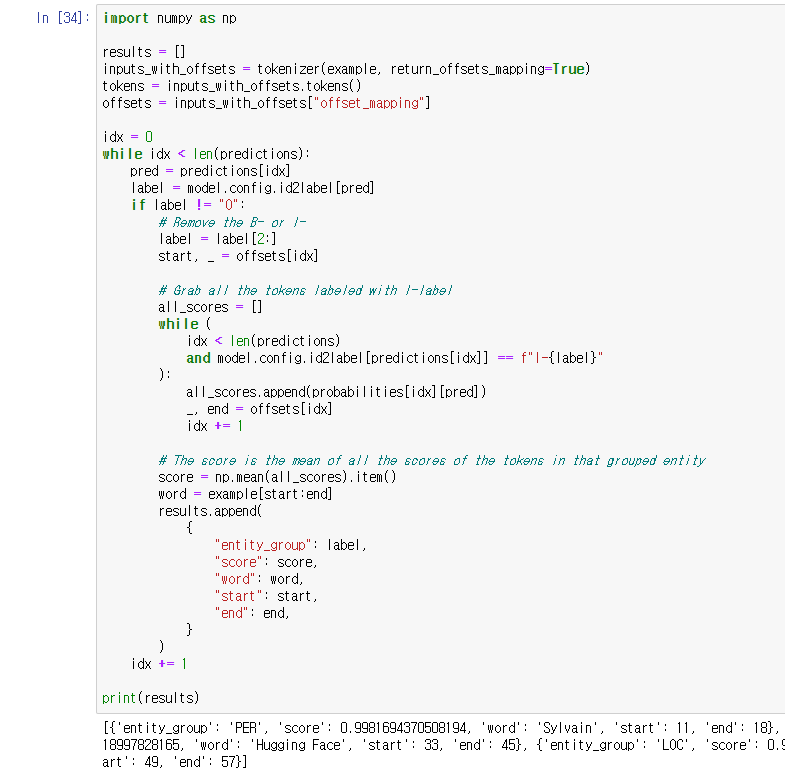 위는 NER 처리된 기반으로 entity와 score, 해당 word를 출력한 것이고
