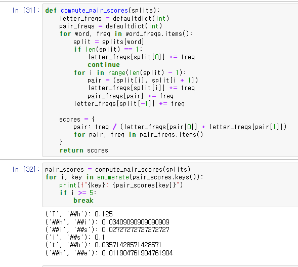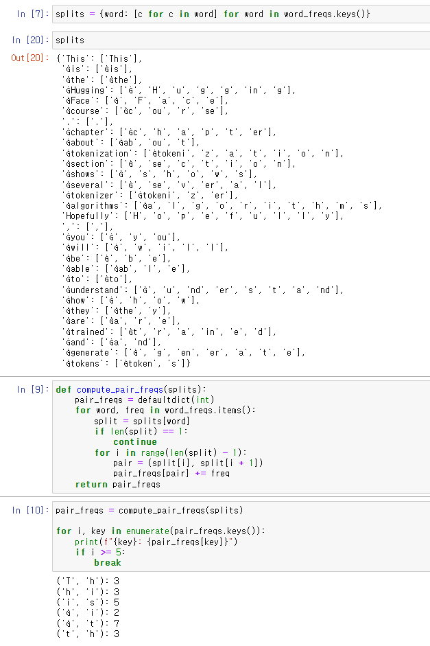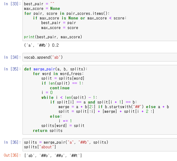 그리고 함수를 작성해 결합된 pair를 split dictionary(corpus)에 반영시켜주었다.