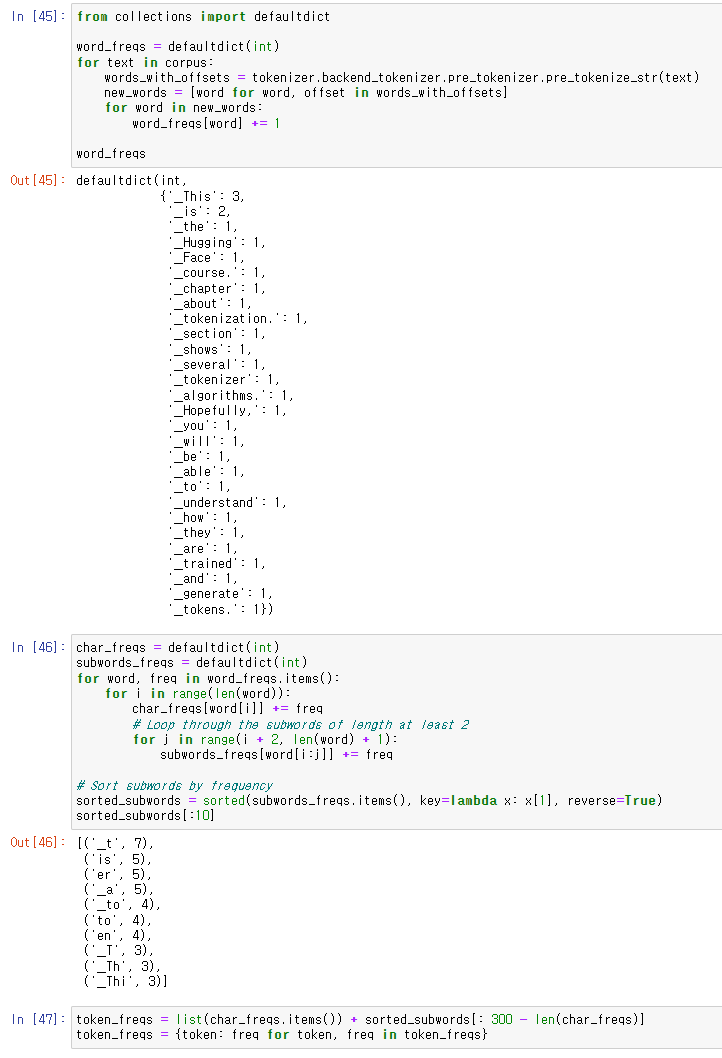 문자의 빈도수와 subword의 빈도수를 체크하고