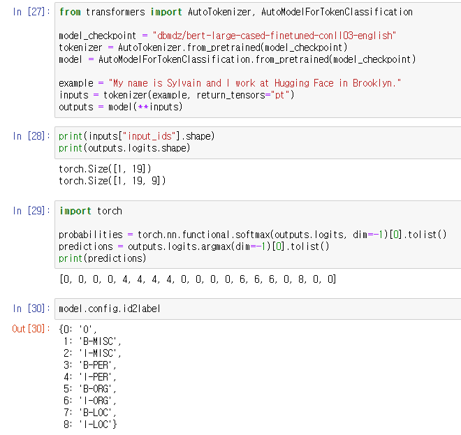 AutoModelForTokenClassification 패키지가 token 기반의 classification 작업을 처리해준다.