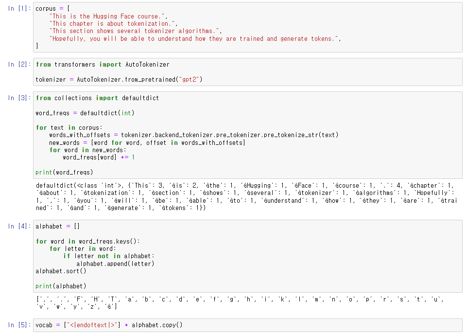 corpus를 pre-tokenization 후, vocabulary를 만들어 주었다.