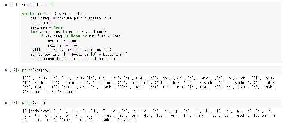 결과로 나온 단어 짝(merge rule)과 vocabulary.
