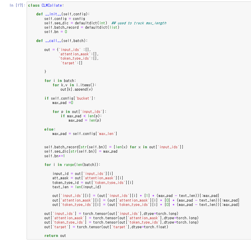 dataloader의 collate_fn 옵션에 CLMcollate(config)의 도출값인 sequence를 입력해주었다.