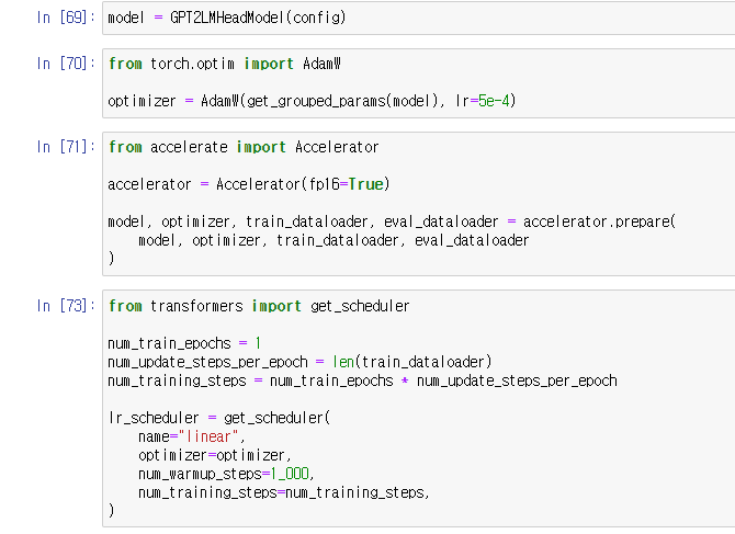 모델을 다시 불러와주었고 optimizer를 정의하고 accelerator를 생성해주었다.