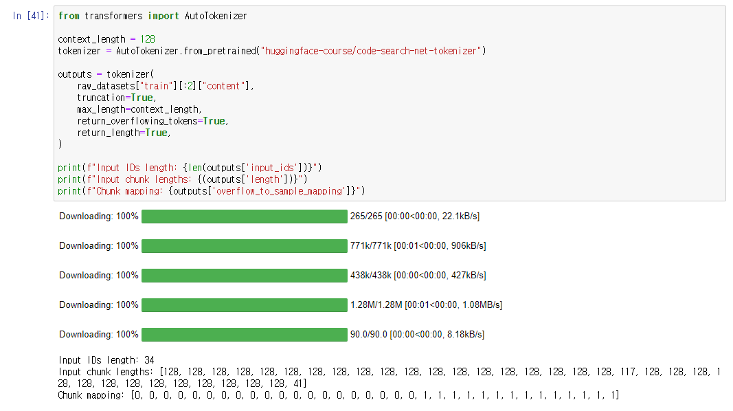 return_overflowing_tokens를 활용해, max_length 이상의 text chunks를 나누어주었다.