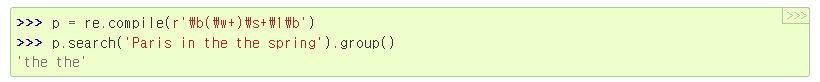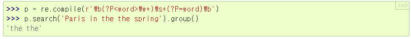| (?P=name) | 이름 있는 그룹에 대한 역참조, 아래 예시 | |