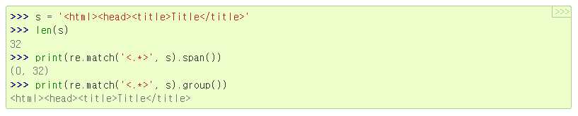 | $ | 줄의 끝부분과 일치 | re.search('}$', '{block}') |
