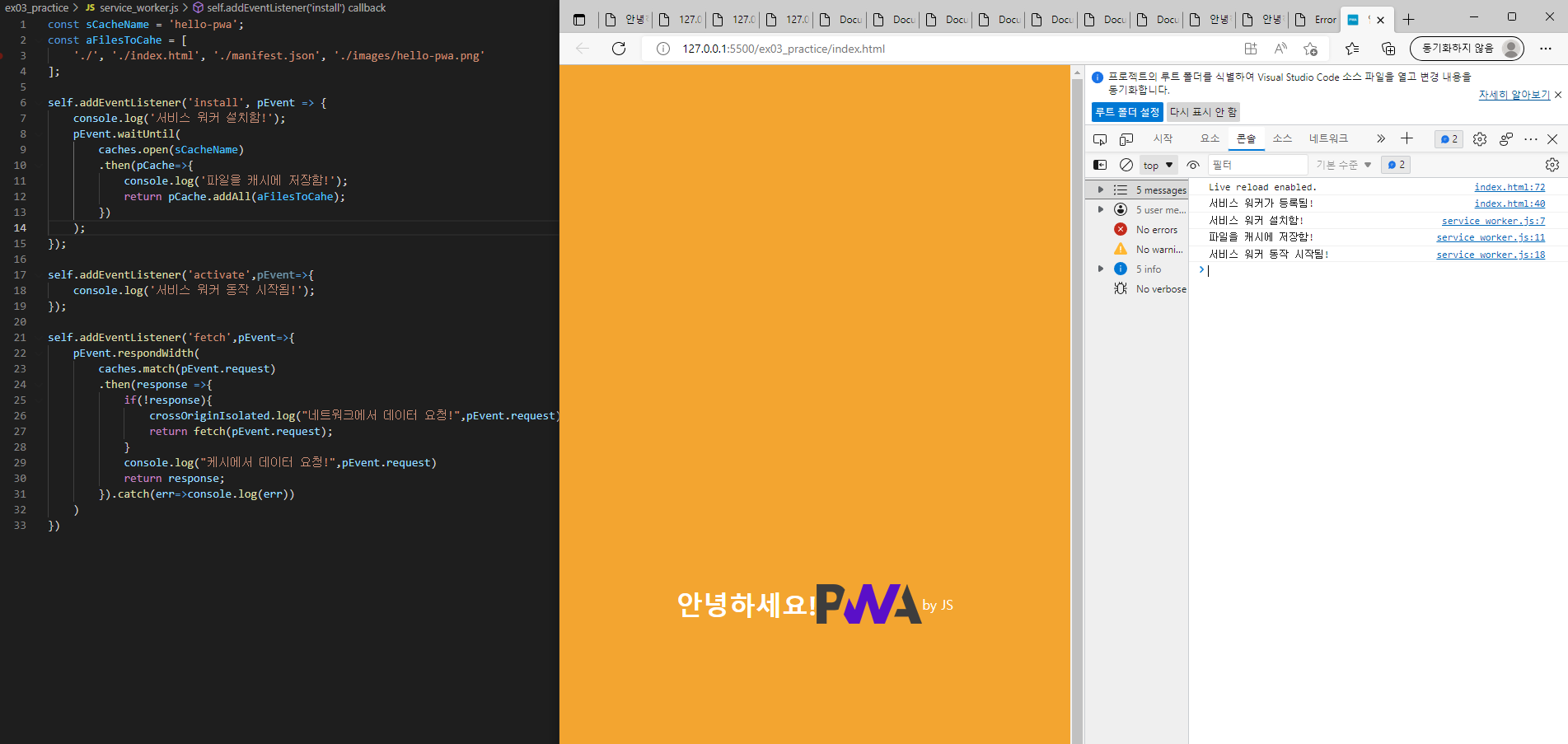 마지막으로 자바스크립트로 PWA를 만들어본 실습의 내용이다.