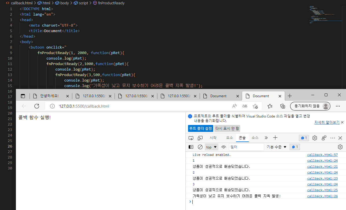 스샷은 콜백함수를 여러 겹으로 쌓아 차례로 실현한 코드와 결과창의 모습을 담고 있다.
