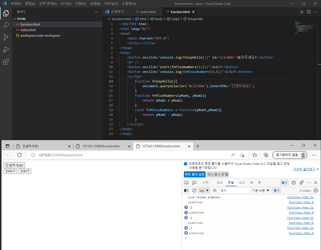 다음은 조금 더 나아가서 함수 선언식과 표현식을 연습한 부분이다.