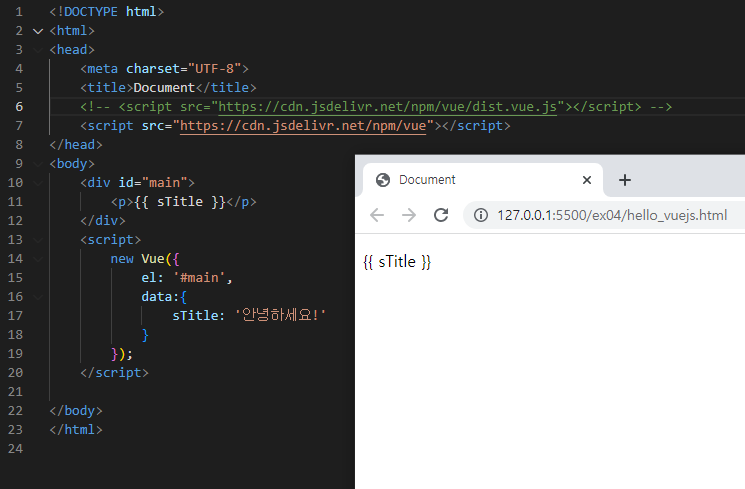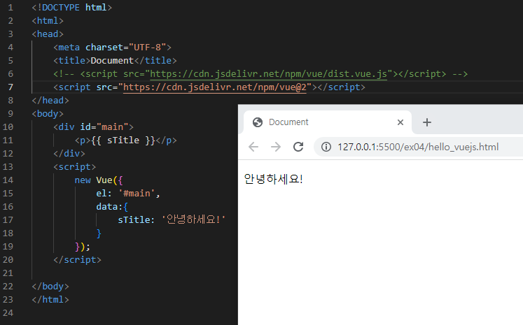 Vue 교재나 한국 가이드에 따라 hello world 예제를 하는 중