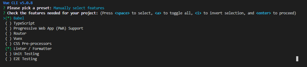 보다시피 Babel, PWA, Router, Vuex, Linter 등의 features를 골라주었고